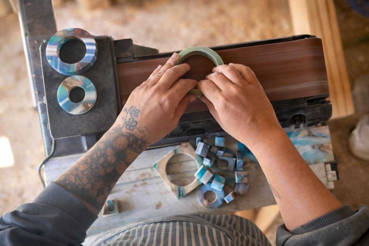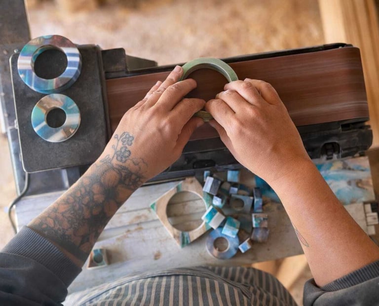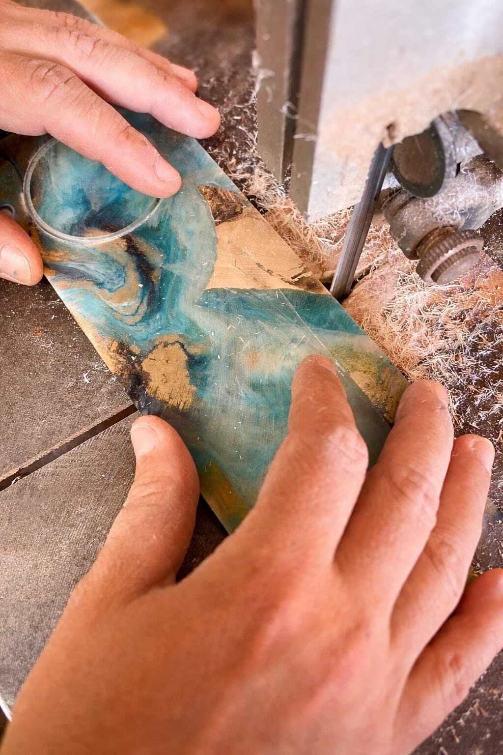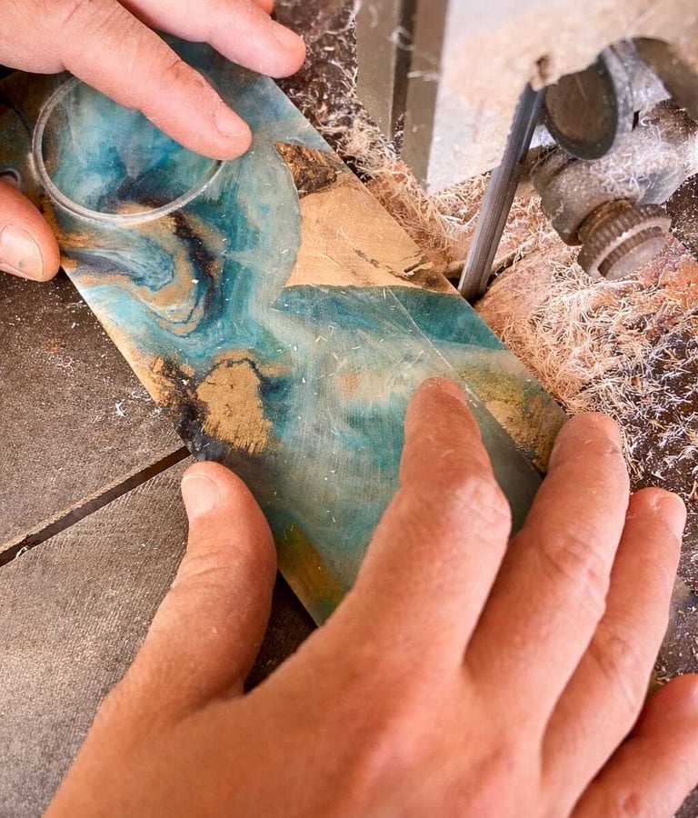 These natural materials are combined with high-quality, food-grade epoxy resin and custom-blended pigments, creating unique visual landscapes within every piece. For this collection, we have also infused the mother board with 24-karat gold leaf. It appears only in select pieces, subtly emerging through the surface.